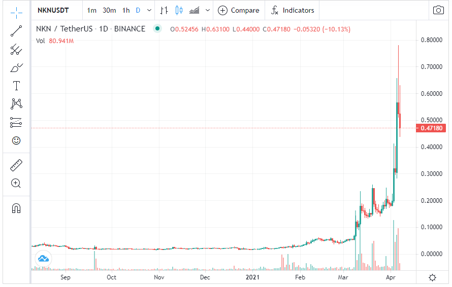New Kind Network (NKN) telah muncul selama sebulan terakhir sebagai salah satu pemenang yang mengejutkan ini, meningkat 1.400% dari level terendah $ 0,052 pada tanggal 8 Maret ke level tertinggi sepanjang masa di $ 0,779 pada 6 April.